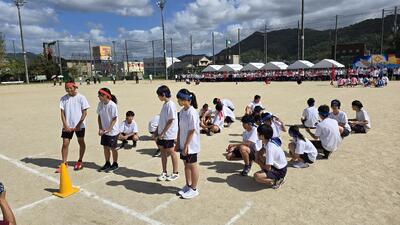 3年生の学年種目は、クラス全員で協力する「ムカデ競走リレー」です。仲間と足をひもで結び、一歩一歩をそろえながらゴールを目指します。