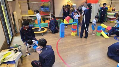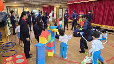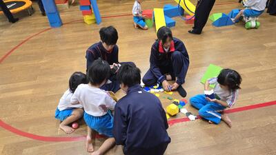 大きな積み木で遊んだり、フラフープを回し合ったりする中で、園児の発想の豊かさに驚いた生徒も多かったようです。短い時間ではありましたが、「相手の気持ちを感じて動くこと」「伝わるように表現すること」の大切さを体感した、有意義な学びの場となりました。