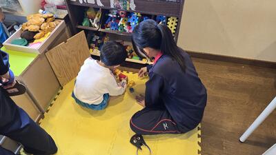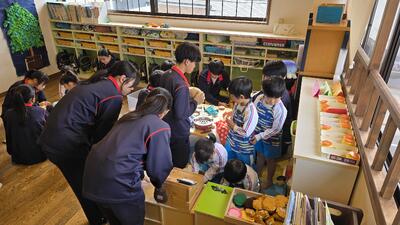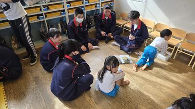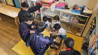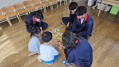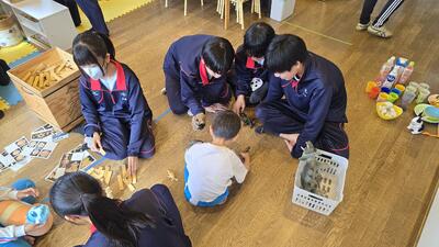 園児のみなさんと一緒に遊んだり、積み木やカードゲームを楽しんだり、読み聞かせや生活のサポートを体験する中で、生徒たちは子どもたちの笑顔に自然と寄り添い、やさしい声かけや安全への気配りを自ら実践する姿が多く見られました。