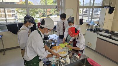 生徒たちは、普段なら捨てられてしまうはずの食材を「おいしく変身」させるレシピを自分たちで考案。タブレットで調理手順を確認し合いながら、切る・炒める・揚げるなど、役割を分担して協力して作業を進めていました。