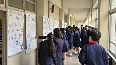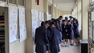 多くの生徒が廊下に集まり、「この絵すごい!」「面白いね」と会話を弾ませながら、