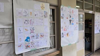 現在、校内の廊下にて生徒たちの作品を集めた「年賀状展」が開催されています。