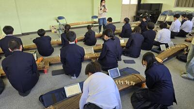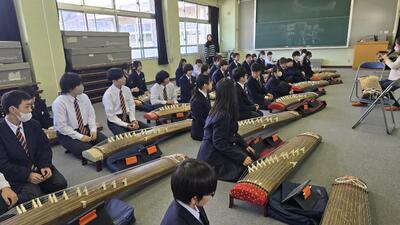 初めて本物の琴に触れる生徒も多く、最初は緊張した面持ちでしたが、立道先生の丁寧なレクチャーを受けるうちに、教室には美しい音色が響き始めました。 また、今回の授業ではタブレット端末を活用し、デジタル譜面を見ながら練習に取り組むという、伝統とICTが融合した新しい学びの姿も見られました。