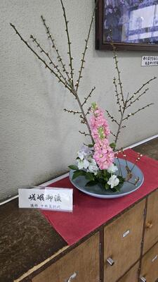 職員玄関に、春の訪れを感じさせる素晴らしい生け花が届きました。 この作品は、ボランティアで嵯峨御流の先生によるものです。