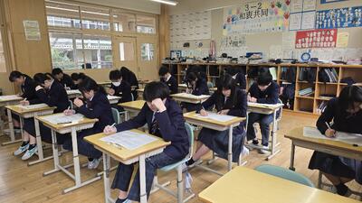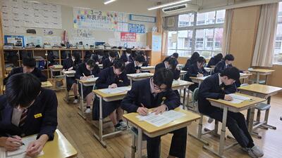 本日の1時間目、3年2組の英語単元テストの様子です。 週末に控えた公立高校中期選抜に向け、教室内は集中力に満ち溢れています。