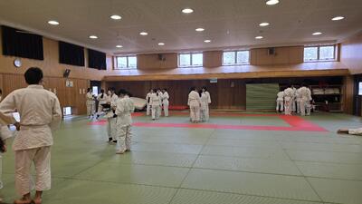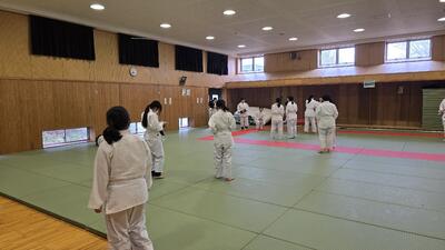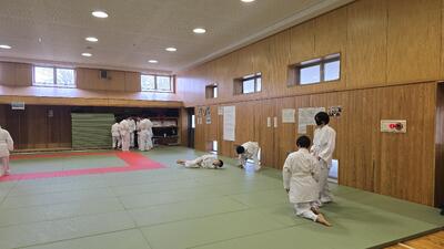 本日4時間目、2年4組の柔道の授業が行われました。 全8回におよぶ柔道の単元もいよいよ大詰め(第7時)を迎え、本日のメインイベントは「前回り受け身」の実技テストです。
