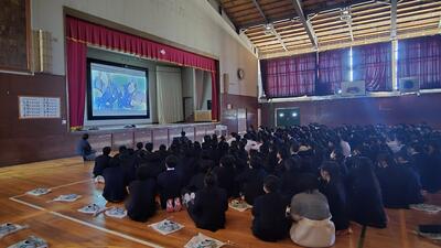 スクリーンには活動の軌跡をたどる映像も映し出され、生徒たちは真剣な表情で見入っていました。
