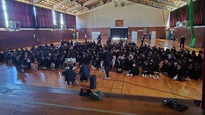 体育館では、3年生の代表生徒による探究発表が行われました。「自分の言葉で語る」その堂々とした姿は、1・2年生にとって大きな刺激と模範となりました。 続く「笑タイム」のオープニングでは、有志によるバンド演奏が披露され、会場のボルテージは一気に最高潮へ!