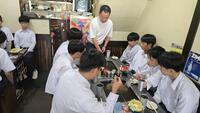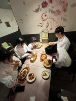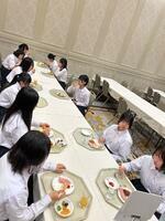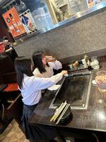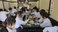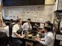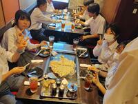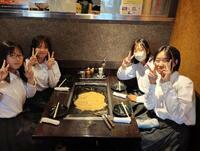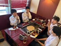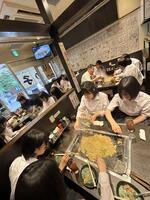 関西といえばお好み焼き、東京といえばもんじゃ。というわけで、昼食はもんじゃを食べにきています。学級に分かれてお店に入ってます。