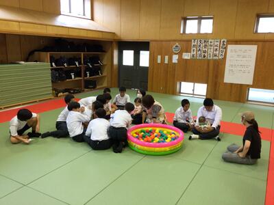 本日、さるなあとさんが来校されました。武道場が子育て広場に早変わり!昼休みにたくさん触れ合いました😆