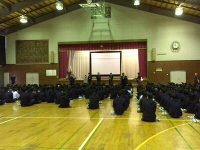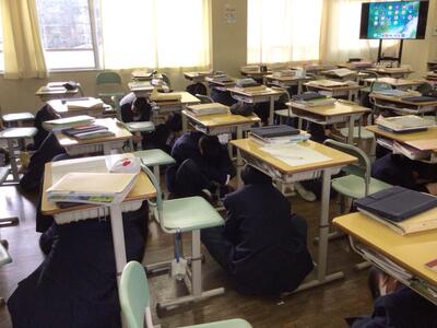 地震を想定した校舎から一次避難場所への避難については、全校生徒と教職員が、避難開始から6分未満で落ち着いて安全に集合し、点呼を終えることができました。