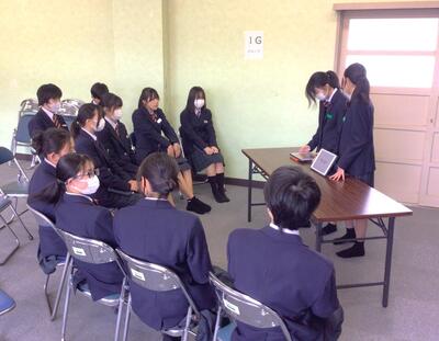 4.5校時を使ってグループごとに1年生の各学級を回り、本年度の「総合的な学習の時間」に展開した2年生の探究活動をまとめた内容を、発表しました。