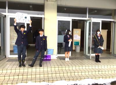 5日と19日の「アルミ缶デー」は両日とも、あいにくの降雪となりました。早朝より、生徒会が登校時の温かいあいさつとともに、啓発や賛同者へのお礼の声かけに励みました。