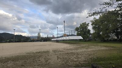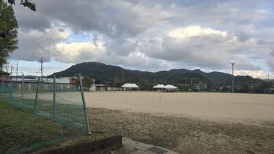早朝の校庭には、曇り空の合間から青空がのぞき、心地よい秋風が吹いています。