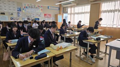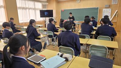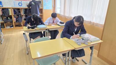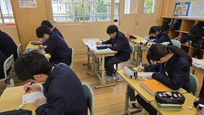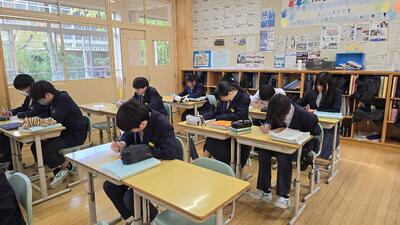 10/29 授業の様子(その2) 投稿: 学校管理者 (10/29) 🧮3年2組 数学の授業 3年2組では、授業開始から4分で「復習プリント」に取り組んでいました。内容は1年生から3年生までの学習範囲全体にわたるもので、これまでの学びを確かめる大切な時間です。生徒たちは真剣な表情で問題に向き合い、自らの力を確かめながら一つひとつ丁寧に解いていました。落ち着いた雰囲気の中に、3年生らしい集中力と意欲が感じられました。