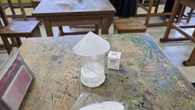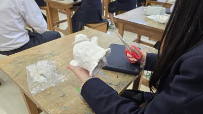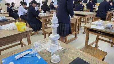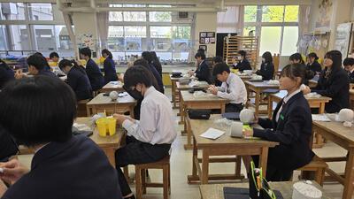 美術の授業では、「明かりと光」をテーマに、身の回りの素材の特徴を生かしたランプづくりに取り組んでいます。