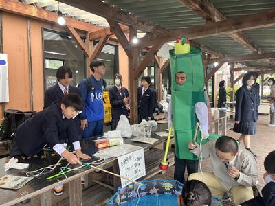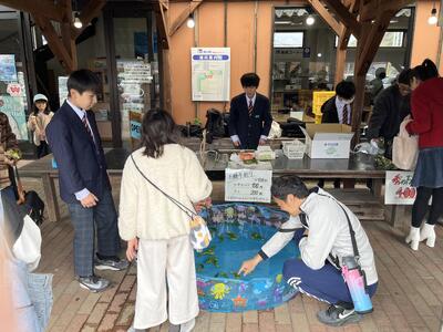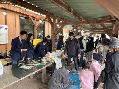 地元の特産品である万願寺甘とうの魅力を知ってもらうため、野菜釣りを企画したり、試食や販売に挑戦したりと、生徒たち自身がアイデアを出して運営しました。会場には多くのお客さんが訪れ、生徒の元気な呼びかけに応えて楽しんでくださいました。