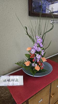 城南中学校 正面玄関に、季節の草花をいけた「嵯峨御流」の作品を飾っています。