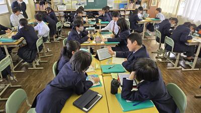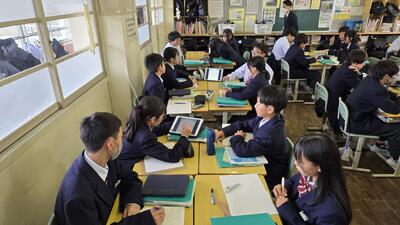 1年3組の理科では、タブレットを活用しながら「どうしてだろう?」という疑問を出し合い、班で意見を交流する学習に取り組んでいます。
