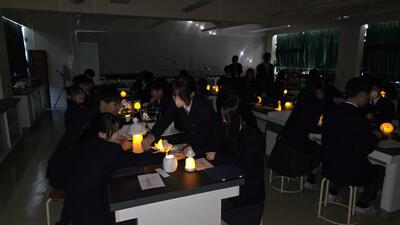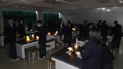 授業のテーマは、城南「光の美術館」。 「どのように鑑賞すれば“明かり”の良さを味わえるだろう」という問いに対し、生徒たちは自作のランプシェードを用いて探究しました。教室の照明を落とすと、そこには幻想的な空間が広がります。生徒たちは、光の漏れ方や影の形、色の変化をじっくりと観察し、お互いの作品の魅力を語り合っていました。