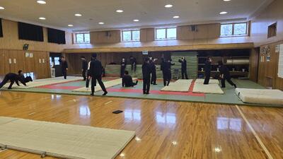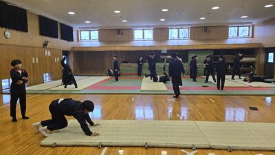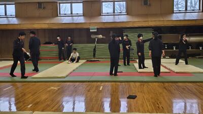 現在、体育館が改修工事中のため、武道場で体育の授業を行っています。 写真は3年3組のマット運動の様子です。 いつもとは違う畳の上での活動ですが、生徒たちは環境の変化にも柔軟に対応し、意欲的に取り組んでいます。武道場には3組の生徒たちの活気ある声が響き、寒さに負けず元気に体を動かしていました。