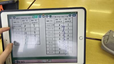 生徒たちは一人一台のタブレット端末(iPad)を活用し、2025年1月と2026年1月のデータを比較。度数分布表から数値を読み取り、累積度数を算出したり、グラフの傾向から「昨年度と今年度で寒さの厳しさはどう変わったか?」を考察したりしました。