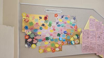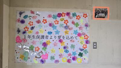 カラフルなお花やリボンの飾りとともに、廊下に彩りを添えるこの掲示物を、生徒たちも嬉しそうに眺めています。保護者の皆様の温かいお気持ちに、心より感謝申し上げます。