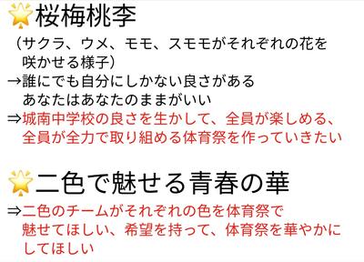 城南中学校では、折しも春からインクルーシブな学校運営モデル事業に取り組んでいます。体育祭で「個性を活かし、心を一つに総がかりで最善を尽くす機会とする」ことを目指したところがスローガンのポイントです。